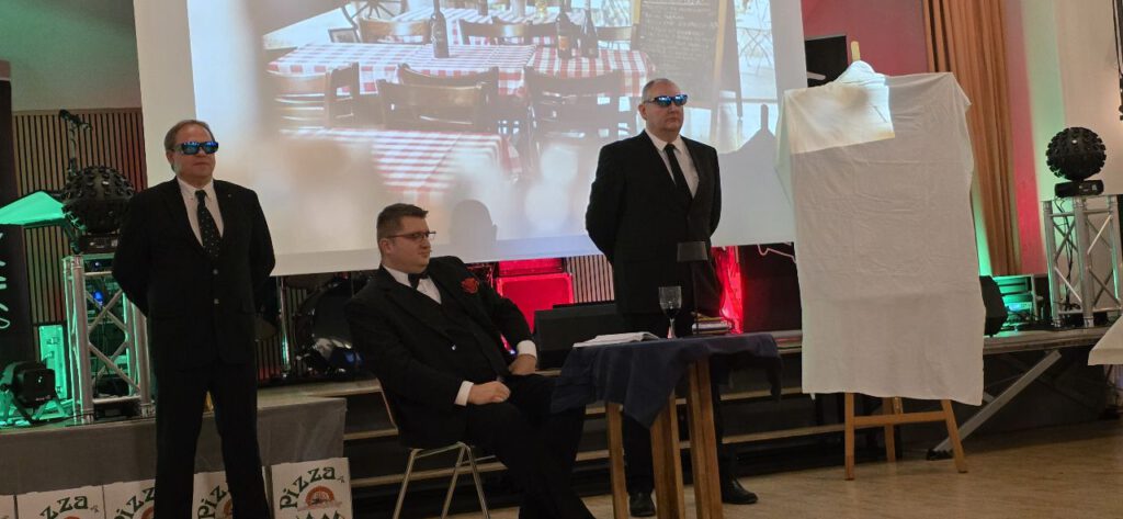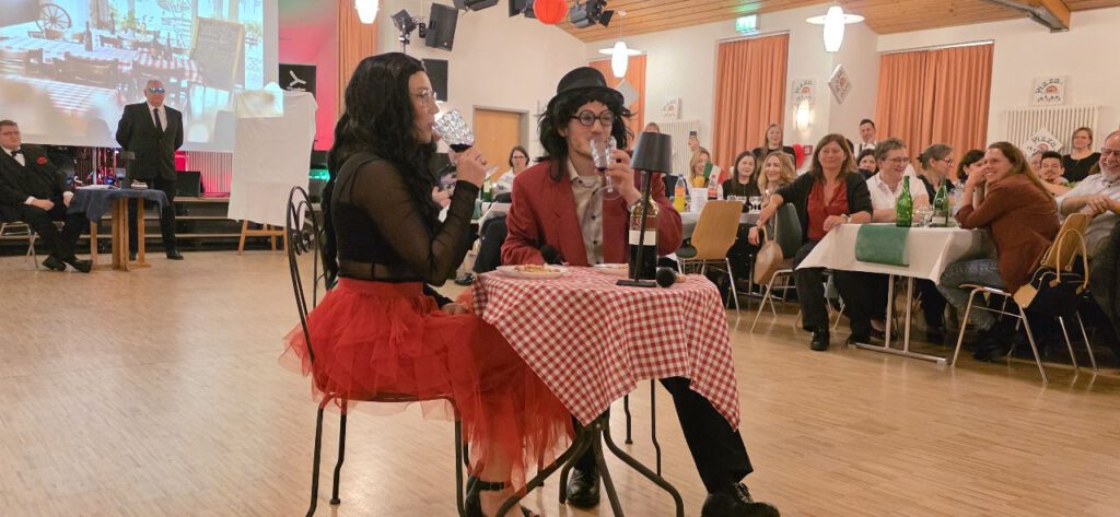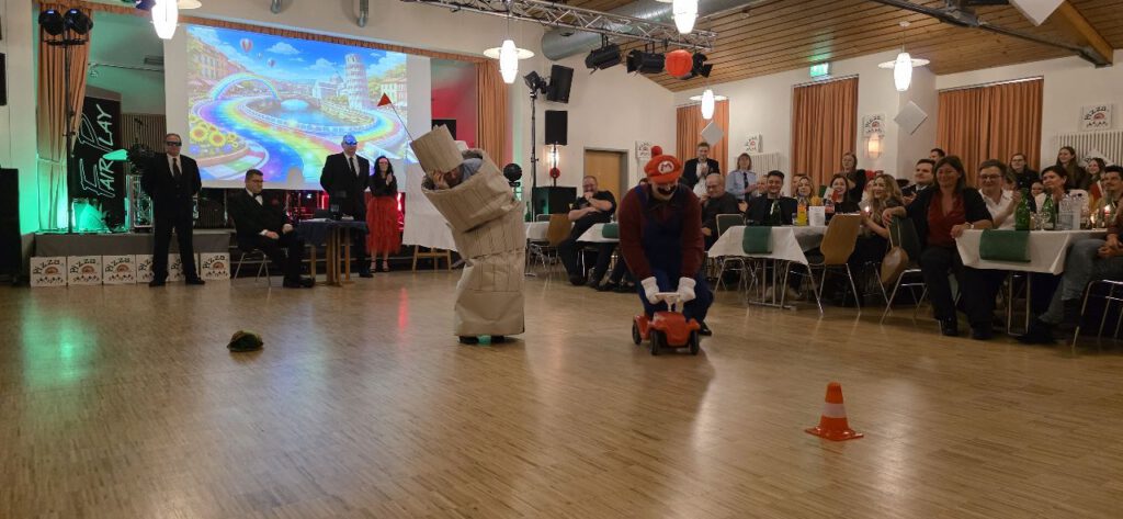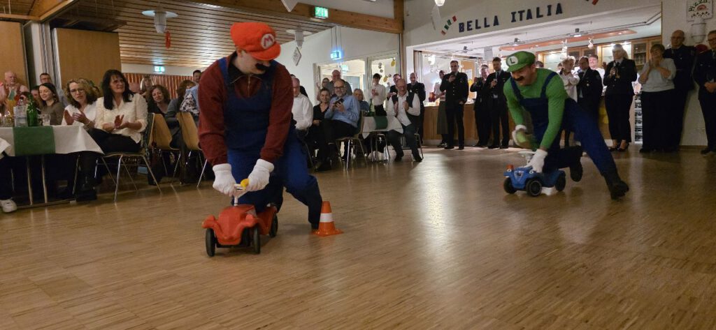 Nach einem gemeinsamen Abendessen zeigten die Aktiven der Wehr wieder einige lustige Sketche. Nachdem der Pate mit seinen Bodyguards eingezogen war, zeigte er den Besuchern die Schönheiten Italiens. Neben Essen und Kleidung durften natürlich Autos nicht fehlen, zwei Figuren aus dem bekannten Spiel Super Mario Kart drehten auf Bobby- Cars ihre Runden um den schiefen Turm von Pisa. Doch Höhepunkt war der Besuch des Künstlers und Universalgelehrten Michelangelo, der ein Bild der beiden Ortsbrandmeister im Stil des Mittelalters zeigte.